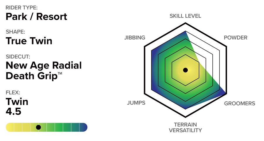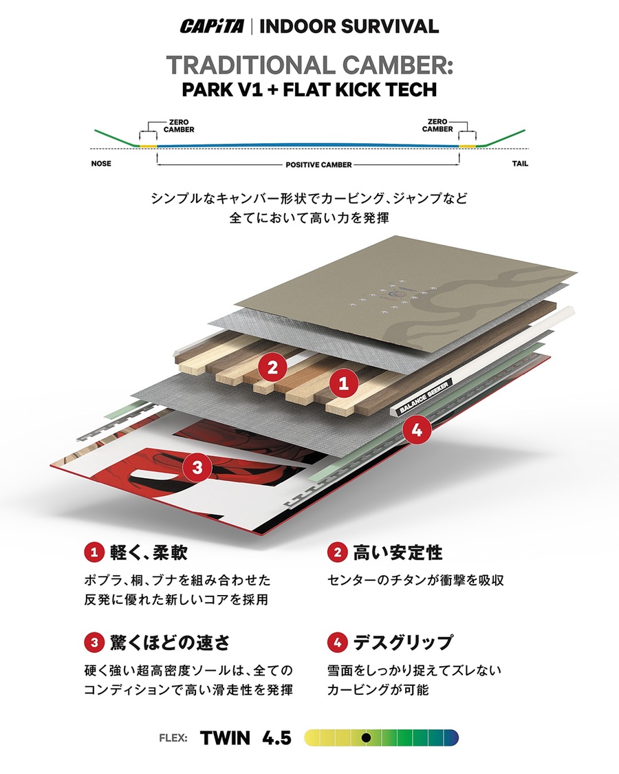「Indoor Survival」は、「Meta Core™」と「Titanal Centerline Booster(チタナル・センターライン・ブースター)」を搭載し、軽量ながら足元に驚異的なレスポンスを生み出すことで、ゲレンデやパークでその真価を発揮します。さらに、「Death Grip™」を採用した「New Age Twin」シェイプが、カービング性能を極限まで高めています。