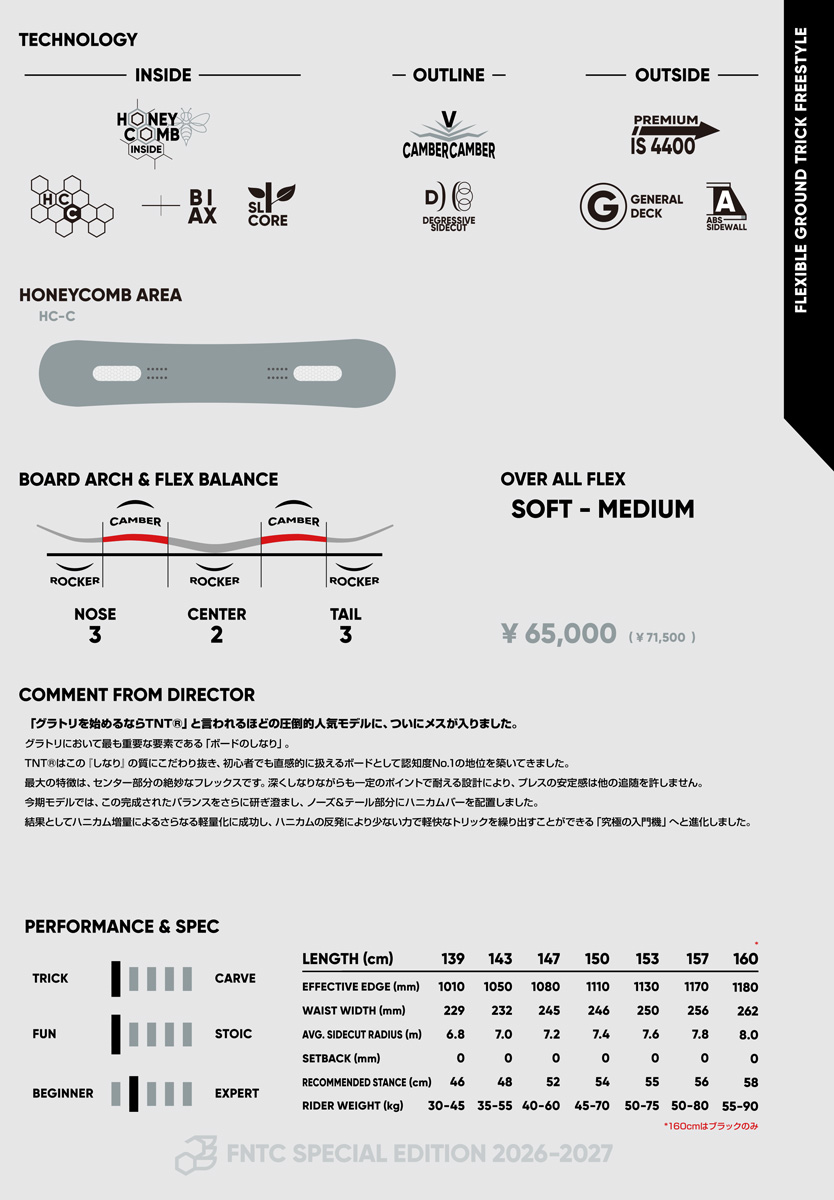 グラトリにおいて最も重要な要素である「ボードのしなり」。 TNT®はこの『しなり』の質にこだわり抜き、初心者でも直感的に扱えるボードとして認知度No.1の地位を築いてきました。 最大の特徴は、センター部分の絶妙なフレックスです。深くしなりながらも一定のポイントで耐える設計により、プレスの安定感は他の追随を許しません。 今期モデルでは、この完成されたバランスをさらに研ぎ澄まし、ノーズ&テール部分にハニカムバーを配置しました。 結果としてハニカム増量によるさらなる軽量化に成功し、ハニカムの反発により少ない力で軽快なトリックを繰り出すことができる「究極の入門機」へと進化しました。