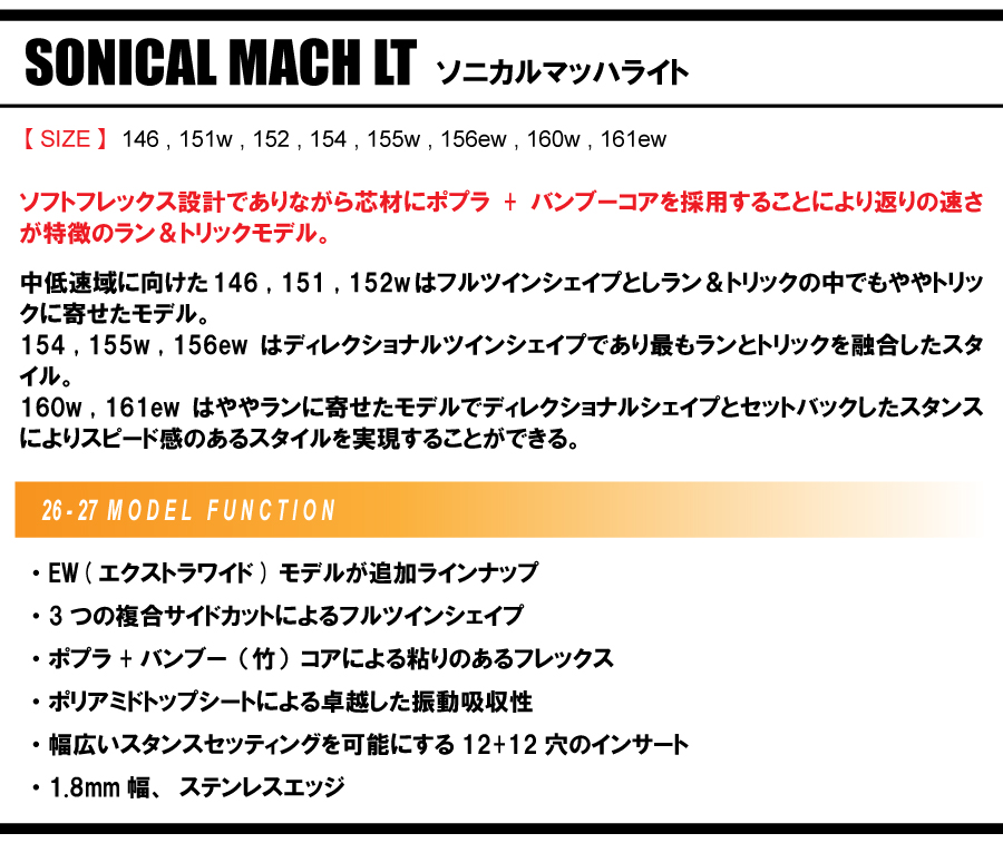 ソフトフレックス設計でありながら、芯材にポプラ+バンブーコアを採用することにより返りの速さが特徴のラン&トリックモデル。中低速域に向けた46,51,52wはフルツインシェイプとし、ラン&トリックの中でもややトリックに寄せたモデル。