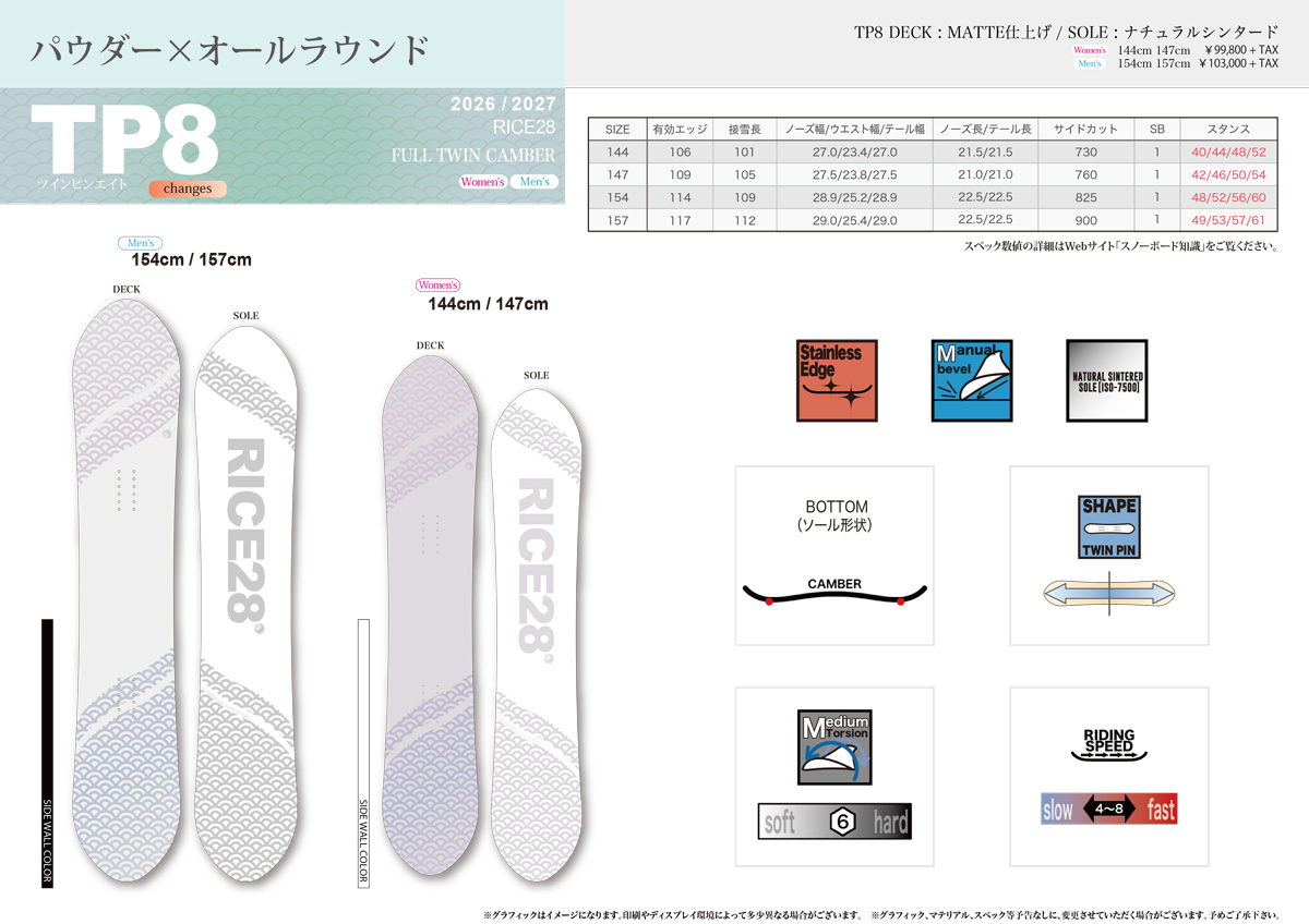 コメント : ツインチップでありながら、パウダーボードとしての性能をしっかり備えたオールラウンドモデル!!