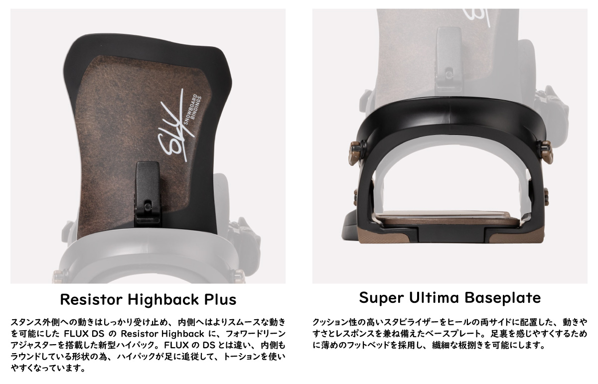 動きやすさと、板の反発力を引き出す操作性を両立させた、トータルバランスに優れたモデルです。FLUXのDSをベースに、より板をしならせ、反発をえやすいよう、SLY専用の新型ハイバックとカーボンディスクを採用しています。