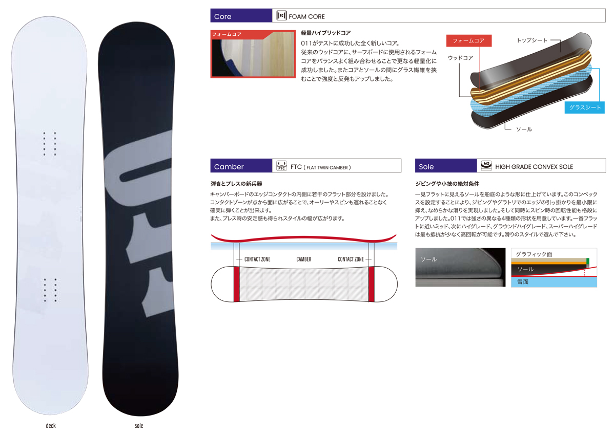 ソフトフレックス&トーションバランスで全てのユーザーを虜にする操作性は011の歴史です。芯材を超軽量フォームコア(サーフボードに使われている素材)にすることで最軽量化に成功しました。ソフトなトーション(ねじれ)でスタイルを出し、全くクセが無く弾けDOUBLE FLYでゲレンデを自由に操れます。今期モデルはセンターつや消しプリントで他にはないシンプルなデザインです。