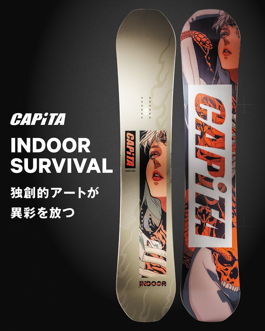 「Indoor Survival」は、「Meta Core™」と「Titanal Centerline Booster(チタナル・センターライン・ブースター)」を搭載し、軽量ながら足元に驚異的なレスポンスを生み出すことで、ゲレンデやパークでその真価を発揮します。さらに、「Death Grip™」を採用した「New Age Twin」シェイプが、カービング性能を極限まで高めています。