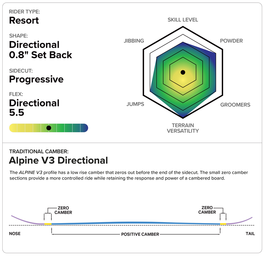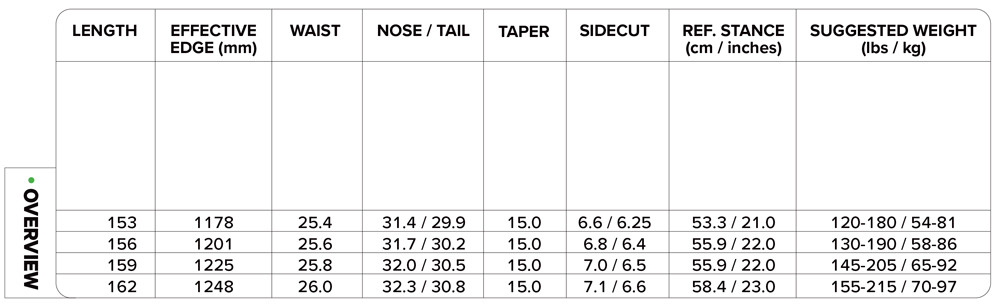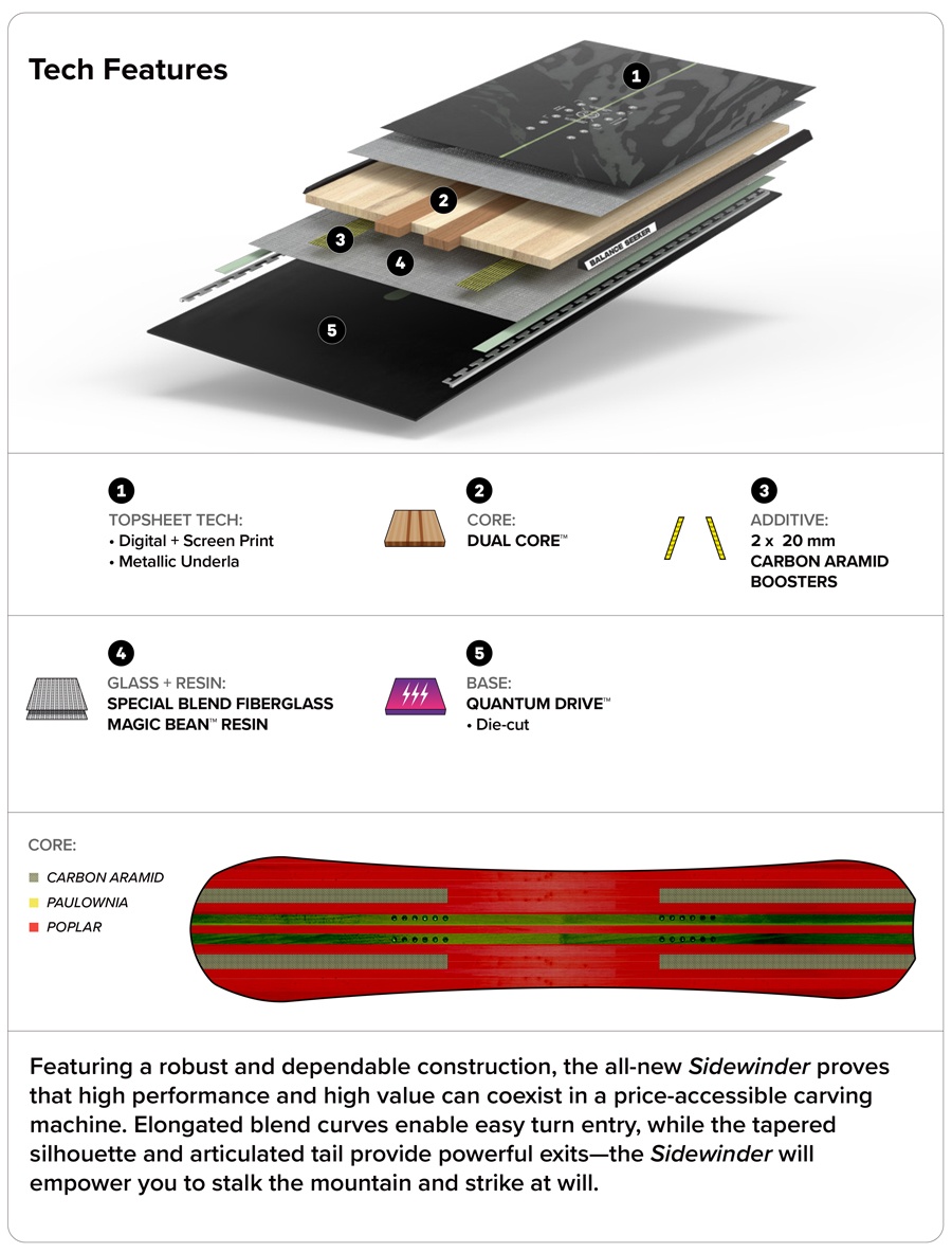 長めに設定されたブレンドカーブ(複合サイドカーブ)がスムーズなターンの入りを可能にしテーパードシルエットとアーティキュレーテッド・テールが力強いターンの抜けを実現します。Sidewinderは、あなたが山を支配し思いのままに攻める力を与えてくれるでしょう。