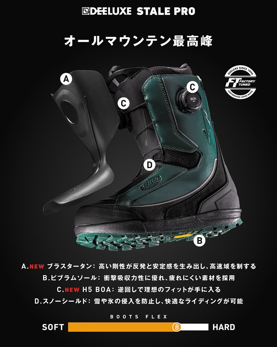 完璧なブーツを求めてDEELUXEとタッグを組んだStåle。私たちは共に、彼の理想とするスペックを完全に具現化したブーツを作り上げました。彼の初となるシグネチャーモデル「Ståle Pro」は、彼自身と同様に多才なブーツです。彼のお気に入りのチームモデルである「Deemon Pro」からインスピレーションを得て開発されたこのブーツは、あらゆる地形で機能するように設計されています。