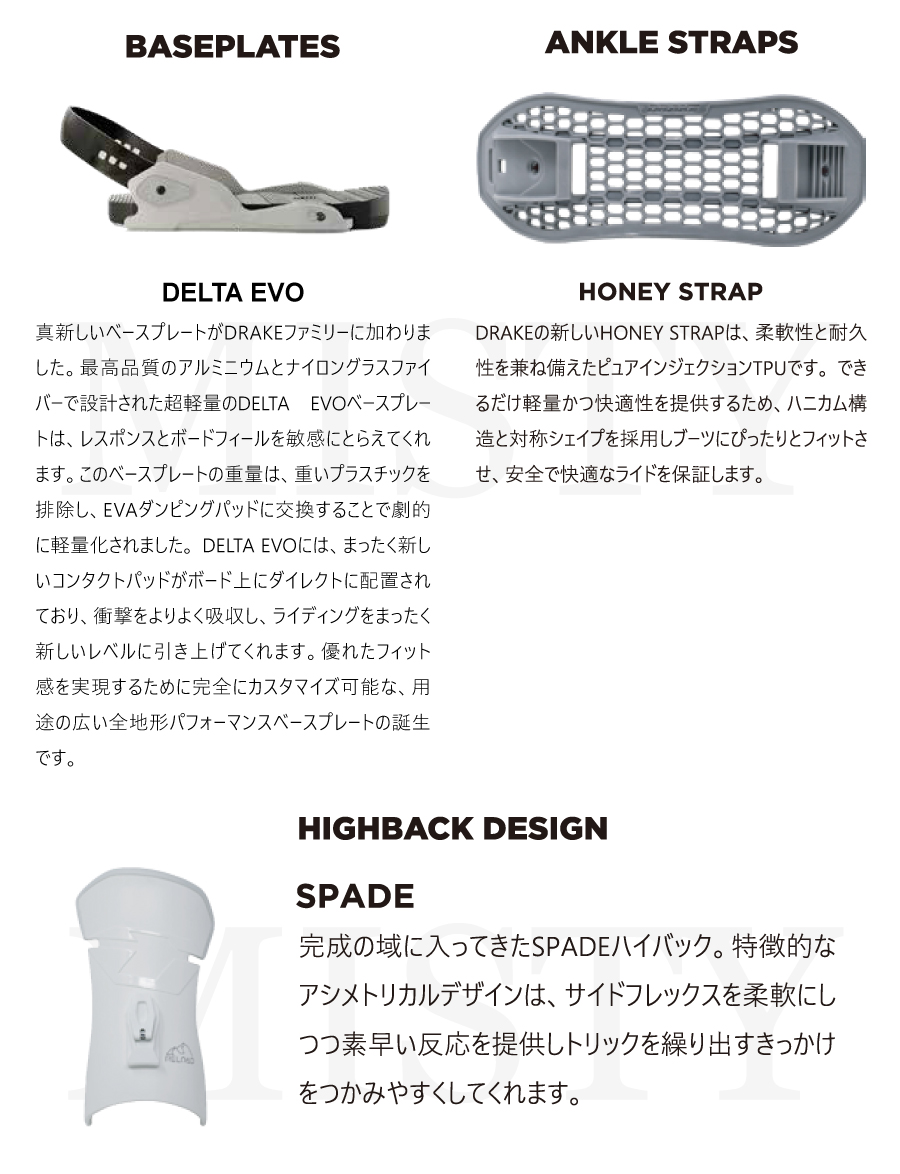 さらに、新しいDELTA EVOベースプレートにより、ライディングフィールにダイレクト感が加わりました。もう1つのポイントは、SPADEHIGHBACKです。このハイバックはドレイクでおなじみ非対称のデザインにより横の動きには柔軟ですが前後の動きには反応良く動いてくれます。