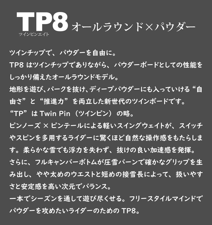 コメント : ツインチップでありながら、パウダーボードとしての性能をしっかり備えたオールラウンドモデル!!