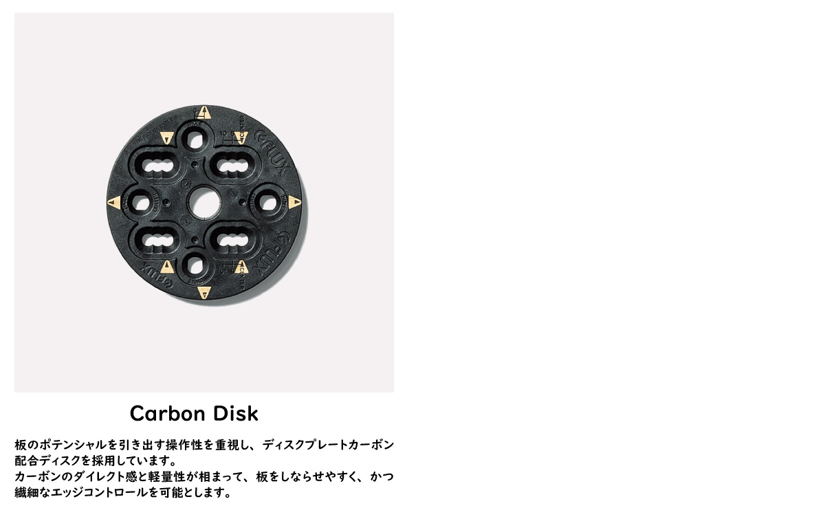 動きやすさと、板の反発力を引き出す操作性を両立させた、トータルバランスに優れたモデルです。FLUXのDSをベースに、より板をしならせ、反発をえやすいよう、SLY専用の新型ハイバックとカーボンディスクを採用しています。