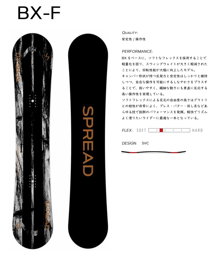 キャンバー形状が持つ反発力と安定性はしっかりと維持しつつ自在な操作を可能にするしなやかさをプラスすることで扱いやすく、繊細な動きにも素直に反応する高い操作性を実現している。ソフトフレックスによる足元の自由度の高さはグラトリとの相性が非常によく、プレス・バター・回し系などあらゆる技で抜群のパフォーマンスを発揮。軽快でリズムよく滑りたいライダーに最適な一本となっている。
