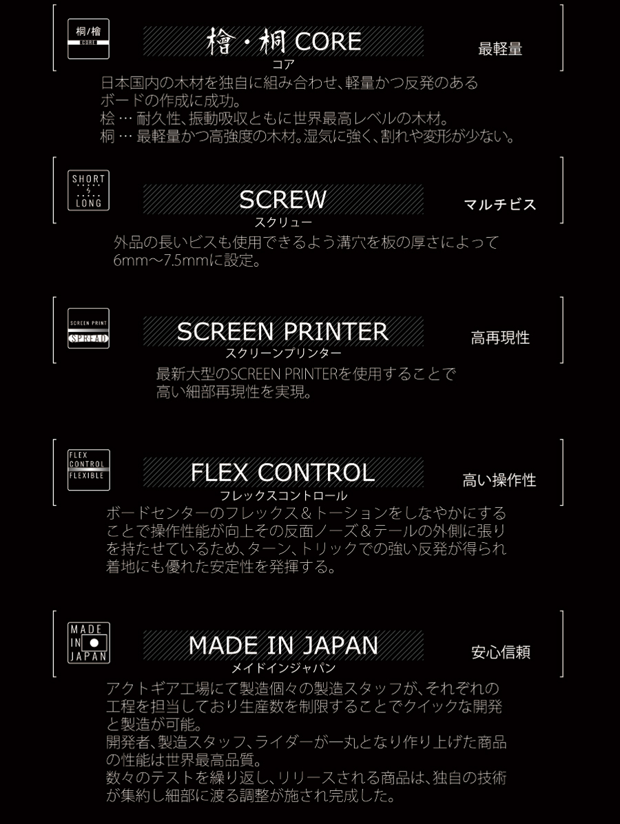 可変キャンバーを採用することで高い汎用性と順応性を備えたモデル。ノーズとテールにフラットゾーンを設けることで接雪が安定し着地やプレスといった動作が行いやすく多様なトリックをよりイージーに楽しめる設計となっている。